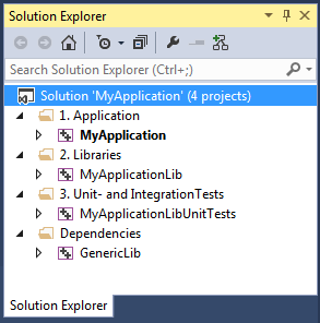 I prefer expressing the difference between project a solution owns and projects it does not own (dependencies) with the help of Visual Studio’s solution folders. It’s a trick I didn’t come up with myself, I’ve deftly stolen it from a former colleague.